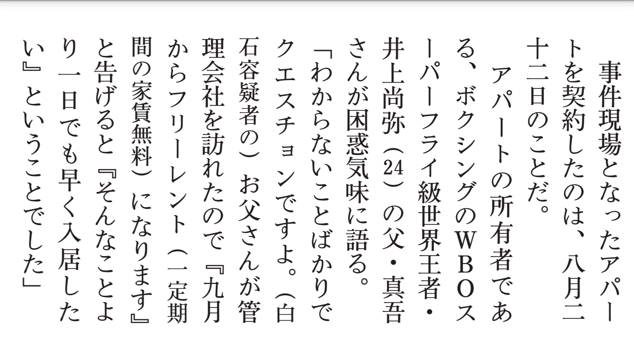 引用元: 【神奈川】座間遺棄事件の家主・ WBO世界スーパーフライ級王者・井上尚弥の父「困惑している」